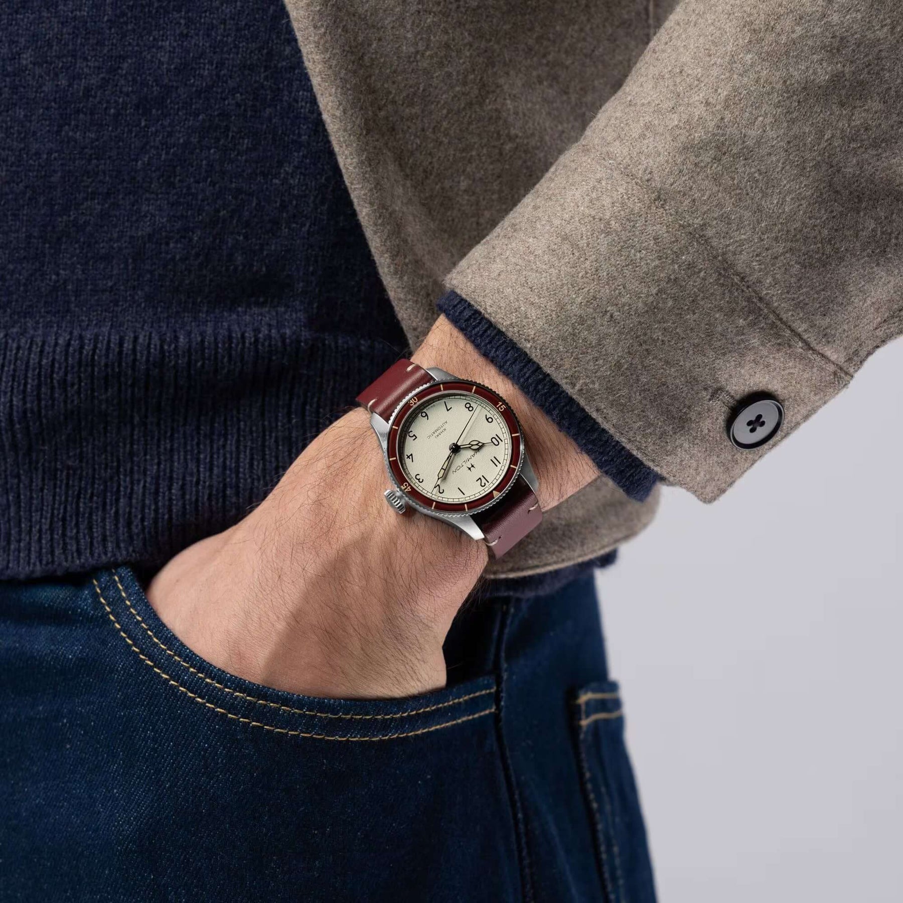 With its distinctive retro charm, the Khaki Pilot Pioneer Auto 38mm continues to honor Hamilton’s rich aviation and military heritage. Shining in burgundy with a colored turning bezel, it is equipped with a H-10 movement and an 80-hour power reserve. Featuring an eggshell-white dial and burgundy leather strap, this is a timepiece that'll never go out of style.