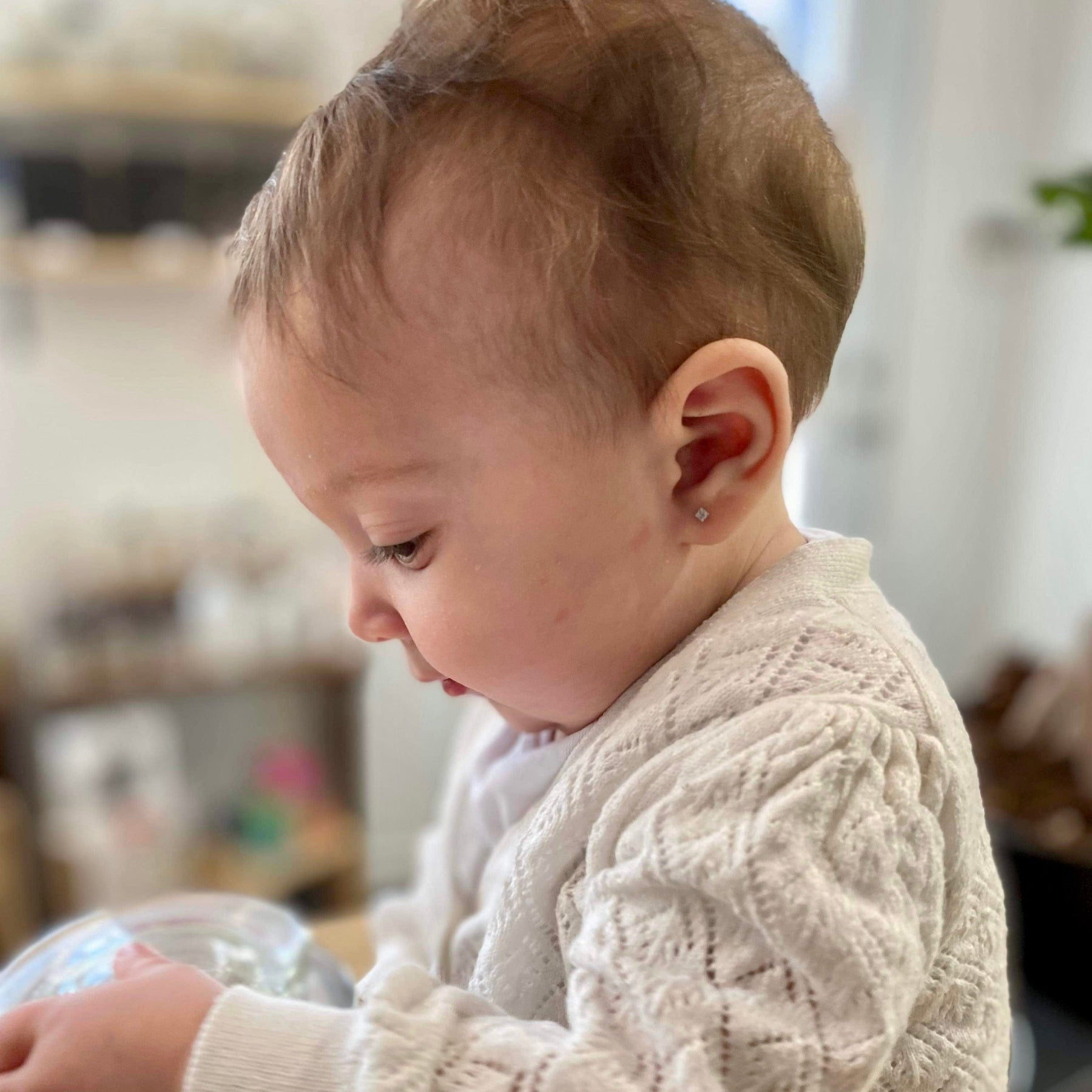 Paire de boucles d'oreilles Les mini Carrés avec moissanites serties sur or 10K, avec tiges et fermoirs vissés à l'arrière. Elles sont parfaites et confortables pour un enfant, mais également pour un adolescent ou adulte.