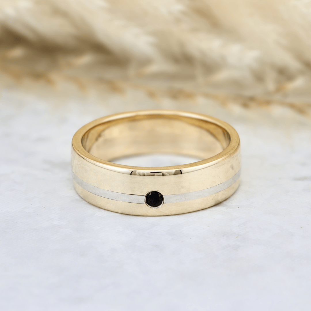 This wedding band relies on a subtle contrast: yellow gold with a white gold inset. At the center, a round black sapphire — discreet, but just enough to add character.