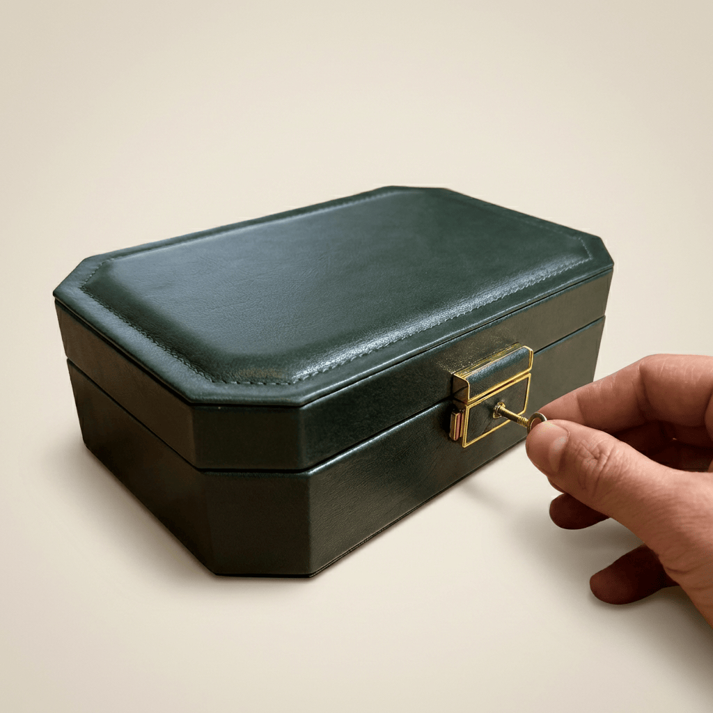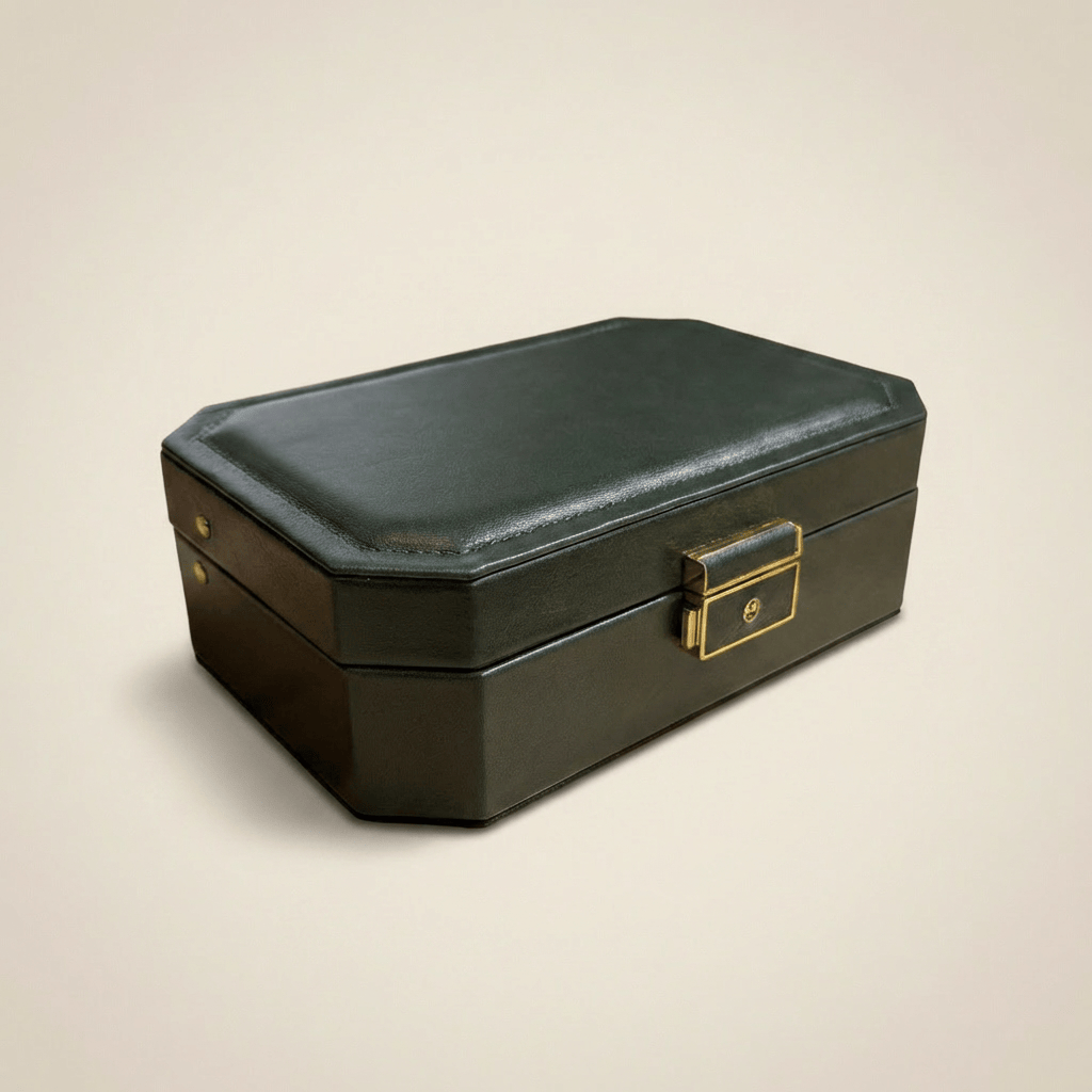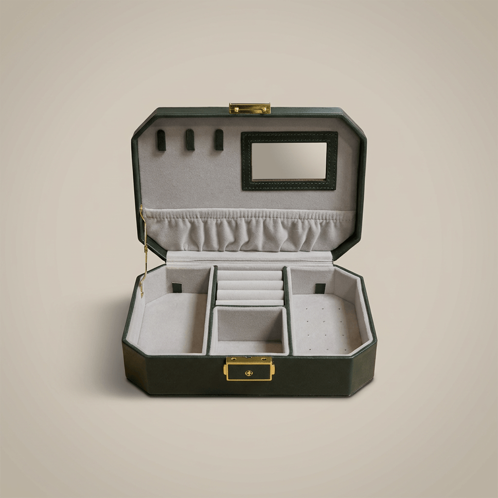 Inside, everything is designed to prevent tangles and friction: integrated mirror, necklace hooks with storage pouch, ring slots, and compartments for separating essentials. The dedicated earring holes keep pairs matched and in place.