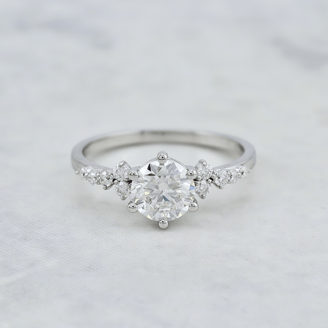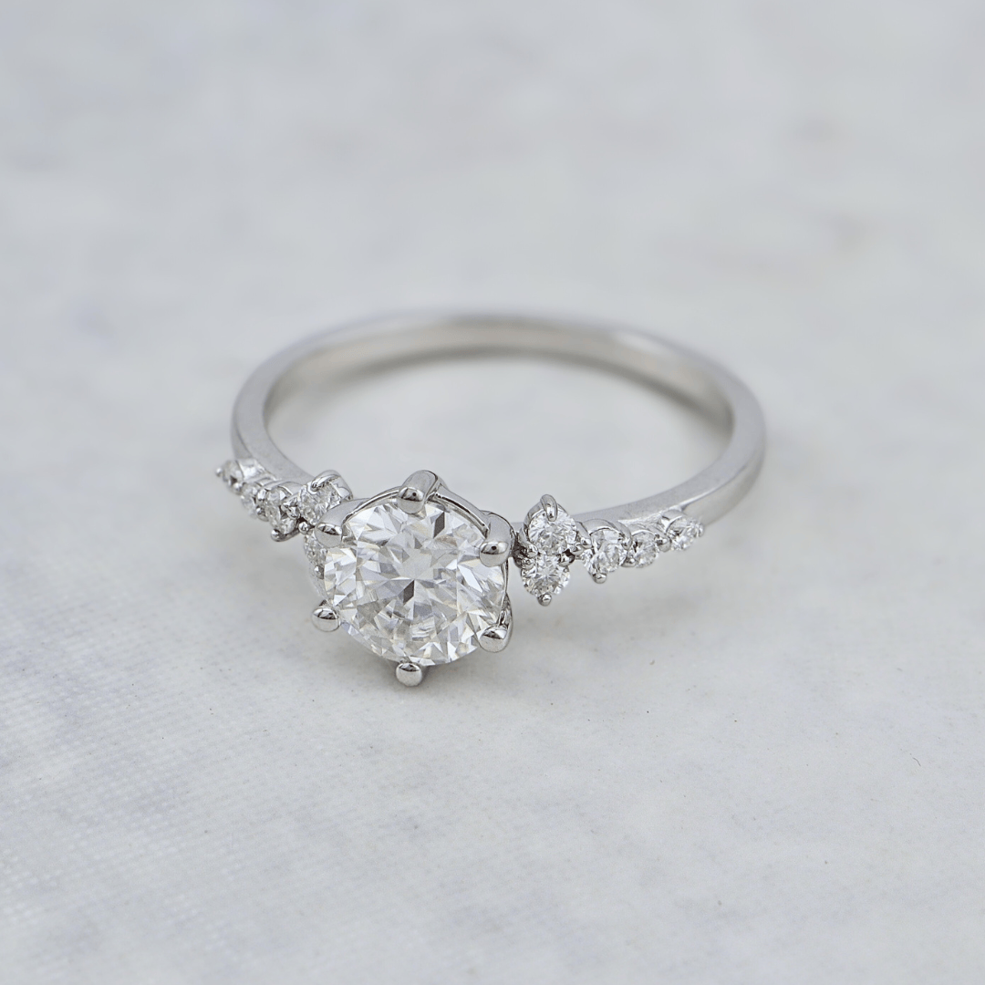 The Nimbus ring by Mathieu Blanchard Joaillerie. Nimbus is a cloud: a composition of small stones placed freely around a central solitaire, as if floating on the ring. We deliberately move away from perfect alignments and overly "straight" lines. The result is more alive, with an impression of movement and relief, while maintaining a clean and modern look.